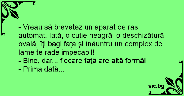 - Vreau să brevetez un aparat de ras automat. Iată, o cutie neagră, o deschizătură ovală, îţi bagi faţa şi înăuntru un complex de lame te rade impecabil!