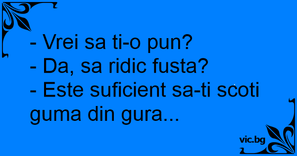 - Vrei sa ti-o pun?- Da, sa ridic fusta?- Este suficient sa-ti scoti guma din gura... 41 0 0 Bancuri Deocheate