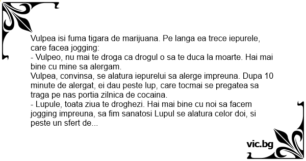 - Vulpeo, nu mai te droga ca drogul o sa te duca la moarte. Hai mai bine cu mine sa alergam.