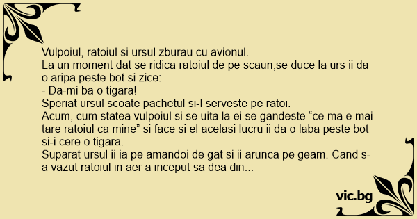 Acum, сuм statea vulpoiul si se uita la ei se gandeste “ce ma e mai tare ratoiul ca mine” si face si el acelasi lucru ii da o laba peste bot si-i cere o tigara.