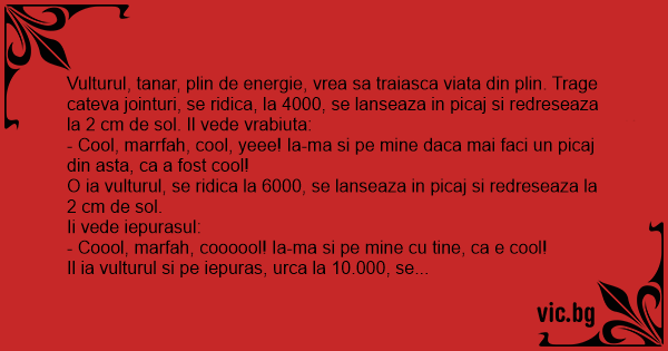 Vulturul, tanar, plin de energie, vrea sa traiasca viata din plin. Trage cateva jointuri, se ridica, la 4000, se lanseaza in picaj si redreseaza la 2 cm de sol. Il vede vrabiuta: