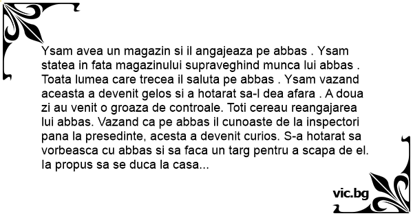 Ysam avea un magazin si il angajeaza pe abbas . Ysam statea in fata magazinului supraveghind munca lui abbas . Toata lumea care trecea il saluta pe abbas . Ysam vazand aceasta a devenit gelos si a hotarat sa-l dea afara . A doua zi au venit o groaza de controale. Toti cereau reangajarea lui abbas. Vazand ca pe abbas il cunoaste de la inspectori pana la presedinte, acesta a devenit curios. S-a hotarat sa vorbeasca cu abbas si sa faca un targ pentru a scapa de el. Ia propus sa se duca la casa alba si sa vorbesca cu bussh. Atunci il va recunoaste de angajat. Abbas a promis ca va iesi cu bussh in balcon . Zis si facut: in fata casei albe ysam a vazut toata scena din balcon . Plin de nervi a intrebat un paznic daca stie cine este in balcon ,la care acesta a raspuns;-domne,pe abbas cine nu-l cunoaste ,dar pe celalalt chiar nu-l stiu.