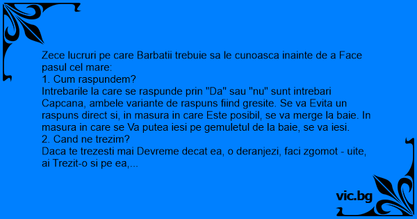 Intrebarile la care se raspunde prin "Da" sau "nu" sunt intrebari Capcana, ambele variante de raspuns fiind gresite. Se va Evita un raspuns direct si, in masura in care Este posibil, se va merge la baie. In masura in care se Va putea iesi pe gemuletul de la baie, se va iesi.