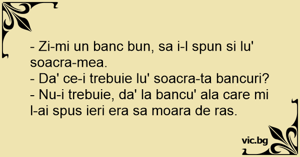 - Zi-mi un banc bun, sa i-l spun si lu' soacra-mea.