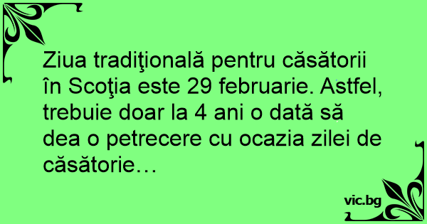 Ziua tradiţională pentru căsătorii în Scoţia este 29 februarie. Astfel, trebuie doar la 4 ani o dată să dea o petrecere cu ocazia zilei de căsătorie…
