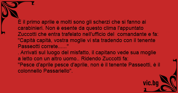 È il primo aprile e molti sono gli scherzi che si fanno ai carabinieri. Non è esente da questo clima l'appuntato Zuccotti che entra trafelato nell'ufficio del comandante e fa: