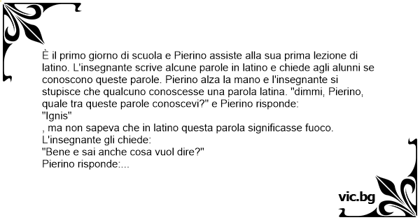 È il primo giorno di scuola e Pierino assiste alla sua prima lezione di latino. L'insegnante scrive alcune parole in latino e chiede agli alunni se conoscono queste parole. Pierino alza la mano e l'insegnante si stupisce che qualcuno conoscesse una parola latina. "dimmi, Pierino, quale tra queste parole conoscevi?" e Pierino risponde: