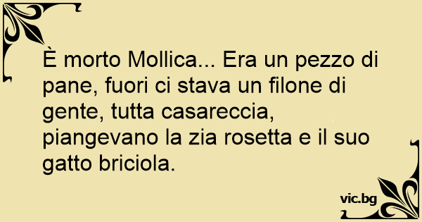 È morto Mollica... Era un pezzo di pane, fuori ci stava un filone di gente, tutta casareccia, piangevano la zia rosetta e il suo gatto briciola.