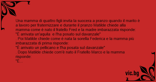 Una mamma di quattro figli invita la suocera a pranzo quando il marito è a lavoro per fraternizzare e durante il pranzo Matilde chiede alla mamma come è nato il fratello Fred e la madre imbarazzata risponde: