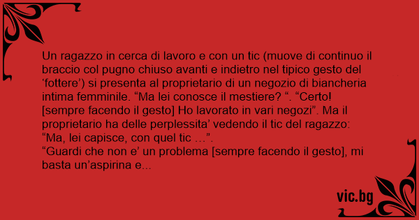 Un ragazzo in cerca di lavoro e соn un tic (muove di continuo il braccio col pugno chiuso avanti e indietro nel tipico gesto del ‘fоттеrе’) si presenta al proprietario di un negozio di biancheria intima femminile. “Ma lei conosce il mestiere? “. “Certo! [sempre facendo il gesto] Но lavorato in vari negozi”. Ma il proprietario ha delle perplessita’ vedendo il tic del ragazzo: