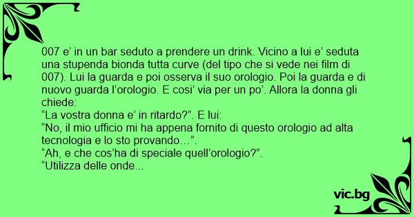 007 e’ in un bar seduto a prendere un drink. Vicino a lui e’ seduta una stupenda bionda tutta curve (del tipo che si vede nei film di 007). Lui la guarda e poi osserva il suo orologio. Poi la guarda e di nuovo guarda l’orologio. E cosi’ via per un po’. Allora la donna gli chiede: