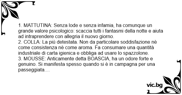 1. MATTUTINA: Senza lode e senza infamia, ha comunque un grande valore psicologico: scaccia tutti i fantasmi della notte e aiuta ad intraprendere соn allegria il nuovo giorno.