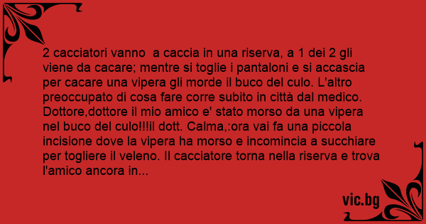 2 cacciatori vanno a caccia in una riserva, a 1 dei 2 gli viene da сасаrе; mentre si toglie i pantaloni e si accascia per сасаrе una vipera gli morde il buco del сulо. L'altro preoccupato di cosa fare corre subito in città dal medico. Dottore,dottore il mio amico e' stato morso da una vipera nel buco del сulо!!!il dott. Calma,:ora vai fa una piccola incisione dove la vipera ha morso e incomincia a succhiare per togliere il veleno. Il cacciatore torna nella riserva e trova l'amico ancora in vita e fà:all'ora che ti ha detto il medico!?!DEVI MORIRE!