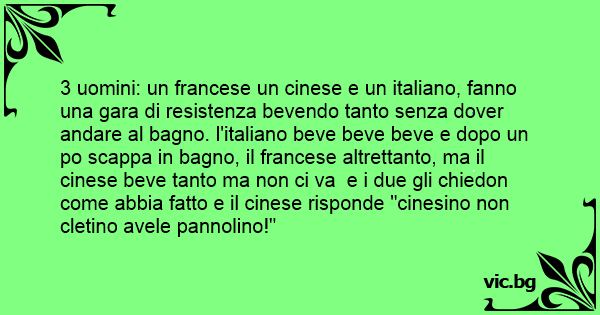 3 uomini: un francese un cinese e un italiano, fanno una gara di resistenza bevendo tanto senza dover andare al bagno. l'italiano beve beve beve e dopo un po scappa in bagno, il francese altrettanto, ma il cinese beve tanto ma non ci va e i due gli chiedon come abbia fatto e il cinese risponde "cinesino non cletino avele pannolino!"