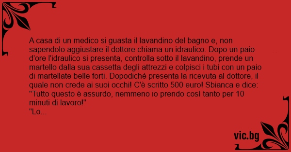 - Γιατρός: Μα, 20 χιλιάρικα για δουλεία λίγων λεπτών ? Ούτε εγώ που είμαι γιατρός δε βγάζω τόσα. - Υδραυλικός: Το ξέρω κύριε. Κι εγώ γιατρός ήμουνα.