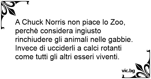 A Chuck Norris non piace lo Zoo, perchè considera ingiusto rinchiudere gli animali nelle gabbie. Invece di ucciderli a calci rotanti come tutti gli altri esseri viventi.