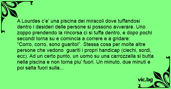A Lourdes c’e’ una piscina dei miracoli dove tuffandosi dentro i desideri delle persone si possono avverare. Uno zoppo prendendo la rincorsa ci si tuffa dentro, e dopo pochi secondi torna su e comincia a correre e a gridare: