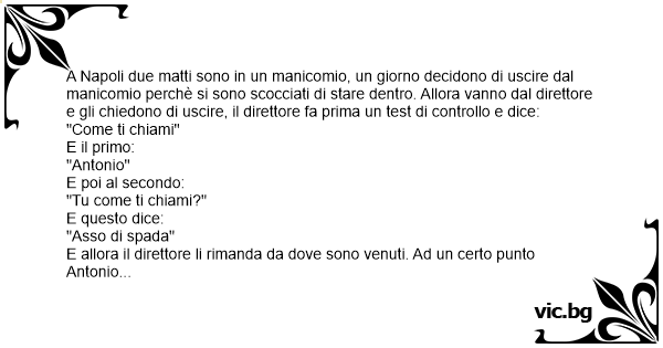 A Napoli due matti sono in un manicomio, un giorno decidono di uscire dal manicomio perchè si sono scocciati di stare dentro. Allora vanno dal direttore e gli chiedono di uscire, il direttore fa prima un test di controllo e dice: