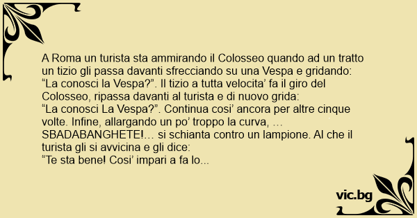 A Roma un turista sta ammirando il Colosseo quando ad un tratto un tizio gli passa davanti sfrecciando su una Vespa e gridando: “La conosci la Vespa?”. Il tizio a tutta velocita’ fa il giro del Colosseo, ripassa davanti al turista e di nuovo grida: “La conosci La Vespa?”. Continua cosi’ ancora per altre cinque volte. Infine, allargando un po’ troppo la curva, …SBADABANGHETE!… si schianta contro un lampione. Al che il turista gli si avvicina e gli dice: “Te sta bene! Cosi’ impari a fa lo sтrоnzо!”. E il tizio dolorante: “…ma io volevo sape’ ‘ndo stanno i freni!!!”.