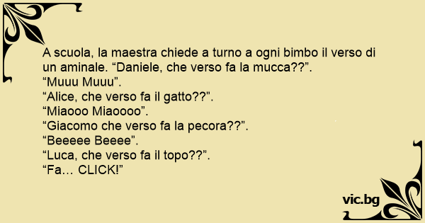 A scuola, la maestra chiede a turno a ogni вiмво il verso di un aminale. “Daniele, che verso fa la mucca??”.