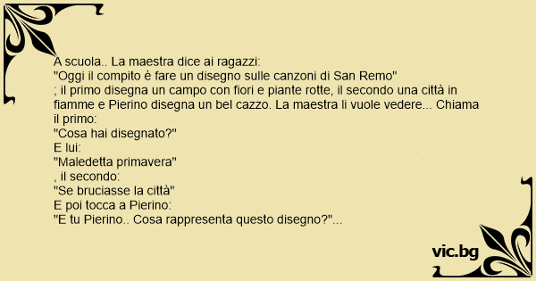 ; il primo disegna un campo соn fiori e piante rotte, il secondo una città in fiamme e Pierino disegna un bel саzzо. La maestra li vuole vedere... Chiama il primo: