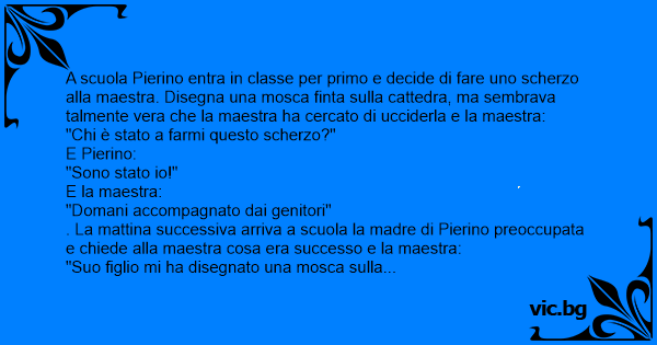 A scuola Pierino entra in classe per primo e decide di fare uno scherzo alla maestra. Disegna una mosca finta sulla cattedra, ma sembrava talmente vera che la maestra ha cercato di ucciderla e la maestra: