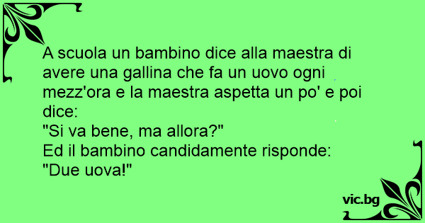 A scuola un bambino dice alla maestra di avere una gallina che fa un uovo ogni mezz'ora e la maestra aspetta un po' e poi dice: