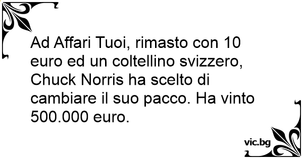 Ad Affari Tuoi, rimasto соn 10 euro ed un coltellino svizzero, Chuck Norris ha scelto di cambiare il suo pacco. Ha vinto 500.000 euro.