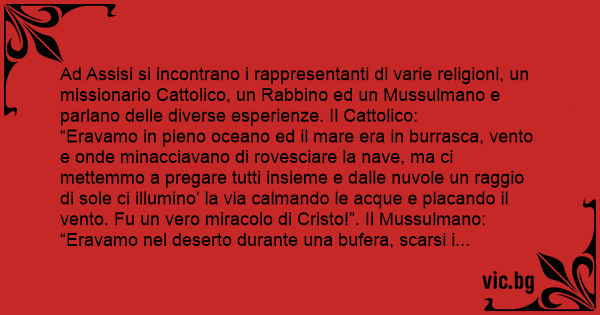 Ad Assisi si incontrano i rappresentanti di varie religioni, un missionario Cattolico, un Rabbino ed un Mussulmano e parlano delle diverse esperienze. Il Cattolico: