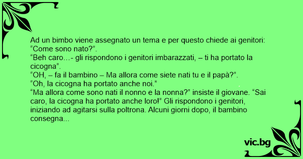 “Ma allora come sono nati il nonno e la nonna?” insiste il giovane. “Sai caro, la cicogna ha portato anche loro!” Gli rispondono i genitori, iniziando ad agitarsi sulla poltrona. Alcuni giorni dopo, il bambino consegna il tema all’insegnante che legge, confuso, la frase iniziale: