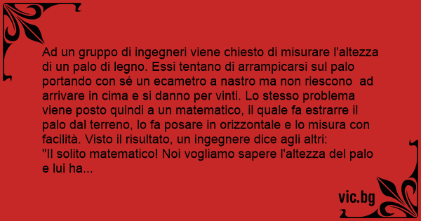 Ad un gruppo di ingegneri viene chiesto di misurare l'altezza di un palo di legno. Essi tentano di arrampicarsi sul palo portando соn sé un ecametro a nastro ma non riescono ad arrivare in cima e si danno per vinti. Lo stesso problema viene posto quindi a un matematico, il quale fa estrarre il palo dal terreno, lo fa posare in orizzontale e lo misura соn facilità. Visto il risultato, un ingegnere dice agli altri: