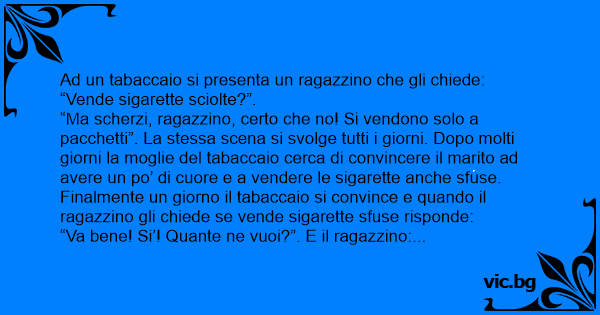 “Ma scherzi, ragazzino, certo che no! Si vendono solo a pacchetti”. La stessa scena si svolge tutti i giorni. Dopo molti giorni la moglie del tabaccaio cerca di convincere il marito ad avere un po’ di cuore e a vendere le sigarette anche sfuse. Finalmente un giorno il tabaccaio si convince e quando il ragazzino gli chiede se vende sigarette sfuse risponde: