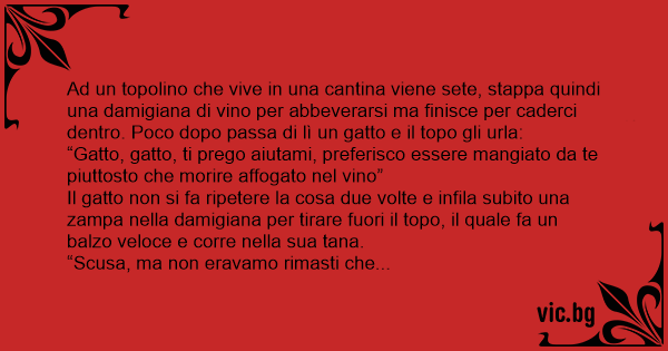 Ad un topolino che vive in una cantina viene sete, stappa quindi una damigiana di vino per abbeverarsi ma finisce per caderci dentro. Poco dopo passa di lì un gatto e il topo gli urla: