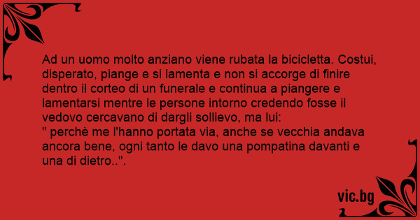Ad un uomo molto anziano viene rubata la bicicletta. Costui, disperato, piange e si lamenta e non si accorge di finire dentro il corteo di un funerale e continua a piangere e lamentarsi mentre le persone intorno credendo fosse il vedovo cercavano di dargli sollievo, ma lui: