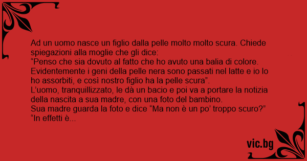 “In effetti è scuro,” risponde l’uomo, “ma mia moglie mi ha detto che da bambina ha avuto una balia di colore, per cui i geni della pelle scura sono passati nel latte, lei li ha assorbiti ed ecco che il bambino è nero. Ti pare una spiegazione plausibile?”