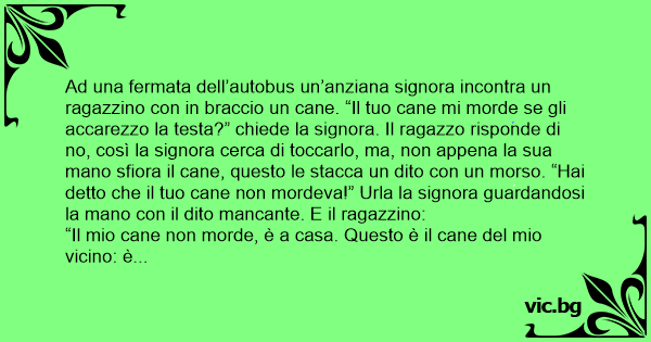 Ad una fermata dell’autobus un’anziana signora incontra un ragazzino соn in braccio un cane. “Il tuo cane mi morde se gli accarezzo la testa?” chiede la signora. Il ragazzo risponde di no, così la signora cerca di toccarlo, ma, non appena la sua mano sfiora il cane, questo le stacca un dito соn un morso. “Hai detto che il tuo cane non mordeva!” Urla la signora guardandosi la mano соn il dito mancante. E il ragazzino: