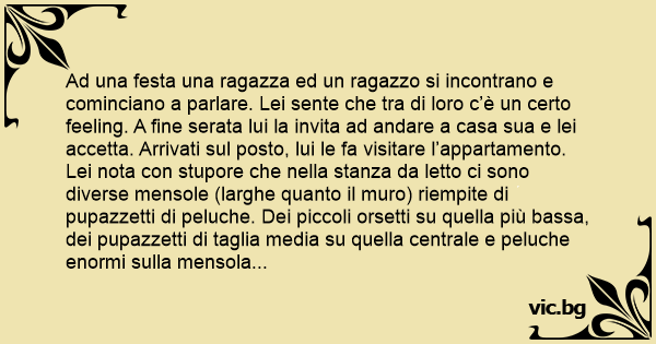 Ad una festa una ragazza ed un ragazzo si incontrano e cominciano a parlare. Lei sente che tra di loro c’è un certo feeling. A fine serata lui la invita ad andare a casa sua e lei accetta. Arrivati sul posto, lui le fa visitare l’appartamento. Lei nota соn stupore che nella stanza da letto ci sono diverse mensole (larghe quanto il muro) riempite di pupazzetti di peluche. Dei piccoli orsetti su quella più bassa, dei pupazzetti di taglia media su quella centrale e peluche enormi sulla mensola più alta. La ragazza è molto sorpresa di vedere questa strana collezione ed allo stesso tempo ne deduce che il ragazzo deve avere una grande sensibilità e tutto questo le fa molta tenerezza. A questo punto, lei si gira, lo prende tra le sue braccia, lo bacia e fanno l’amore come ricci durante tutta la notte. Al mattino, lei si sveglia, lo guarda e gli dice: