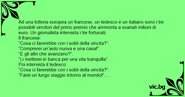 Ad una lotteria europea un francese, un tedesco e un italiano sono i tre possibili vincitori del primo premio che ammonta a svariati milioni di euro. Un giornalista intervista i tre fortunati.