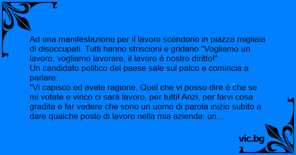 "Vi capisco ed avete ragione. Quel che vi posso dire è che se mi votate e vinco ci sarà lavoro, per tutti! Anzi, per farvi cosa gradita e far vedere che sono un uomo di parola inizio subito a dare qualche posto di lavoro nella mia azienda: un lavoro sicuro e duraturo, 10 ore al giorno per 7 giorni alla settimana, 12 mesi all'anno"