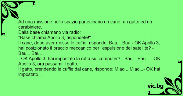 - OK Apollo 3, hai impostato la rotta sul computer? - Bau... Bau... - OK Apollo 3, ora passami il gatto.