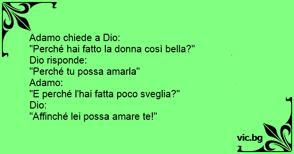 Adam zu Gott: Du, Gott, sag mal, warum hast du Eva eigentlich so unheimlich schön gemacht? Gott: Damit du sie lieben kannst! Adam: Aha! Und warum hast du sie so unheimlich dumm gemacht? Gott: Damit sie dich lieben kann!