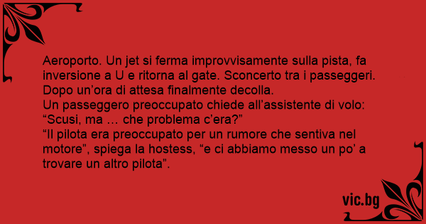 Aeroporto. Un jet si ferma improvvisamente sulla pista, fa inversione a U e ritorna al gate. Sconcerto tra i passeggeri. Dopo un’ora di attesa finalmente decolla.