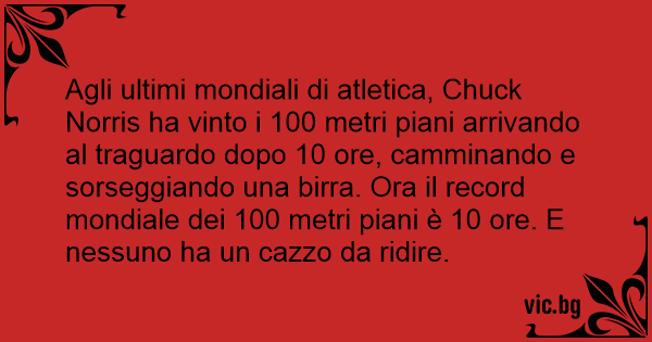 Agli ultimi mondiali di atletica, Chuck Norris ha vinto i 100 metri piani arrivando al traguardo dopo 10 ore, camminando e sorseggiando una birra. Ora il record mondiale dei 100 metri piani è 10 ore. E nessuno ha un саzzо da ridire.