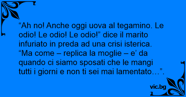 “Ah no! Anche oggi uova al tegamino. Le odio! Le odio! Le odio!” dice il marito infuriato in preda ad una crisi isterica. “Ma come – replica la moglie – e’ da quando ci siamo sposati che le mangi tutti i giorni e non ti sei mai lamentato…”.