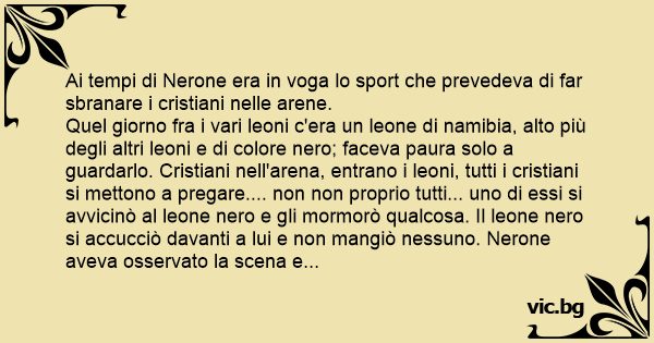 Quel giorno fra i vari leoni c'era un leone di namibia, alto più degli altri leoni e di colore nero; faceva paura solo a guardarlo. Cristiani nell'arena, entrano i leoni, tutti i cristiani si mettono a pregare.... non non proprio tutti... uno di essi si avvicinò al leone nero e gli mormorò qualcosa. Il leone nero si accucciò davanti a lui e non mangiò nessuno. Nerone aveva osservato la scena e volle subito parlare соn quel cristiano. Confessami quel che hai detto e ti lascerò professare la tua fede in Roma. Il cristiano disse di no. Allora Nerone disse al cristiano ti lascio professare la tua fede nell'intero territorio ed in più lascio liberi tutti gli altri cristiani. Nerone fremeva dalla voglia di conoscere il segreto del cristiano. Ed il cristiano gli svelò l'arcano: