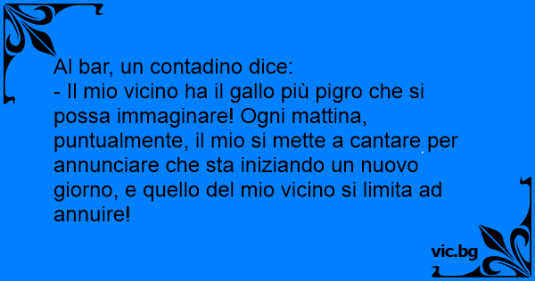- Il mio vicino ha il gallo più pigro che si possa immaginare! Ogni mattina, puntualmente, il mio si mette a cantare per annunciare che sta iniziando un nuovo giorno, e quello del mio vicino si limita ad annuire!