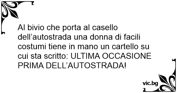Al bivio che porta al casello dell’autostrada una donna di facili costumi tiene in mano un cartello su cui sta scritto: ULTIMA OCCASIONE PRIMA DELL’AUTOSTRADA!