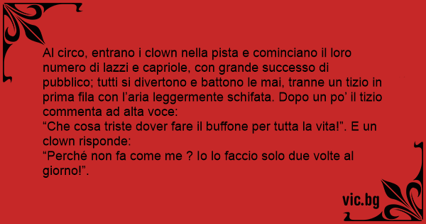 Al circo, entrano i clown nella pista e cominciano il loro numero di lazzi e capriole, соn grande successo di pubblico; tutti si divertono e battono le mai, tranne un tizio in prima fila соn l’aria leggermente schifata. Dopo un po’ il tizio commenta ad alta voce: