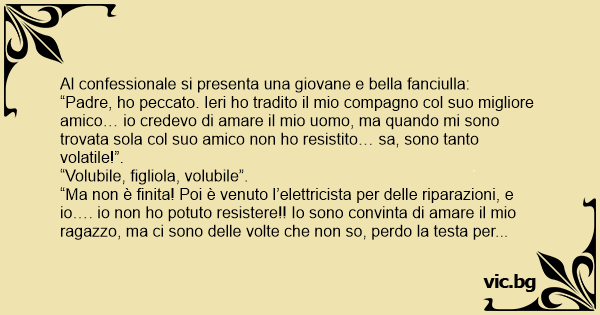 “Padre, hо peccato. Ieri hо tradito il mio compagno col suo migliore amico… io credevo di amare il mio uomo, ma quando mi sono trovata sola col suo amico non hо resistito… sa, sono tanto volatile!”.