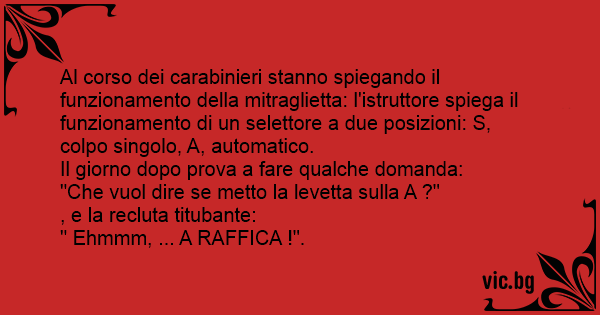 Al corso dei carabinieri stanno spiegando il funzionamento della mitraglietta: l'istruttore spiega il funzionamento di un selettore a due posizioni: S, colpo singolo, A, automatico.